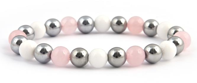 A karkötő 8 mm-es rózsakvarc, tejkvarc és ezüstszínű hematit ásvány gömbökből készült, gyöngyfűző gumira fűzve. A karkötő méretének meghatározása : a csuklód pontos méretéhez adj hozzá 1,5 cm-t. KÉRLEK VÁLASSZ MÉRETET ! Az ásványok nem helyettesítik az orvosi diagnózist és kezelést. A rózsakvarc hatása : a rózsakvarc segít letenni a lelki terheket. Megszaba