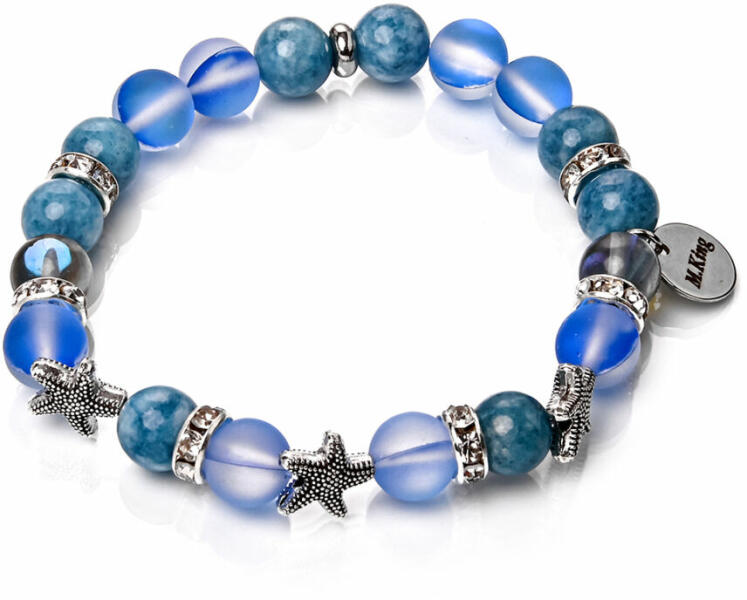 Gyönyörű fényű és színű aventurin és nagyon csillogó osztrák kristály ásvány karkötő cuki tengeri csillag díszekkel, mintha csuklódon viselnéd az óceán kékjét... A Maria King kollekció exkluzív darabja. Figyelem! A képen exkluzív kivitelű, rugalmas karkötő látható kapocs nélkül, de kérheted extra erős acélsodronyra is delfinkapoccsal és 5 cm hosszabbítólánc