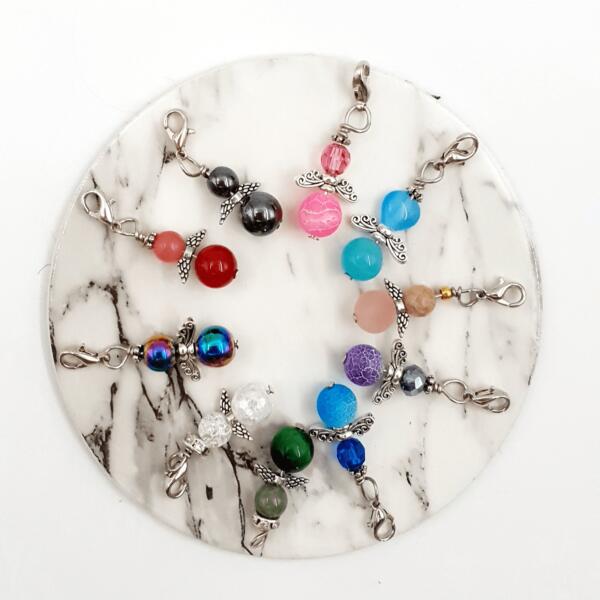 Angyalka medál kulcstartó, több színben. Az angyalka mérete 2 cm és különböző ásványokból és kristályokból készültek, illetve egy kapcsot tartalmaz, mellyel kulcsra, táskára helyezhető. Az ár egy darab termékre vonatkozik.