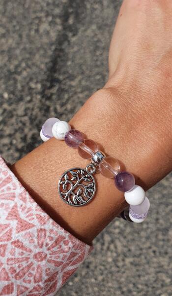 Gyönyörű csiszolt, 8mm átmérőjű tündöklő ásványkarkötő, Életfa medálkával. A karkötő a következő ásványokat tartalmazza:*howlit*ametis zt*roppantott hegyikristály*áttetsző hegyikristály*tejkvarc