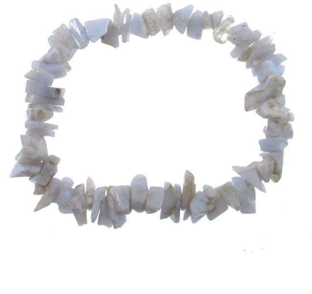 Kalcedon ásványból készült splitter ( chips ) szemcse gumis karkötő. A karkötőben lévő ásványok valamelyikbe kisebb, valamelyikbe nagyobb szemekből áll, de próbáltam egyenletesre fűzni. Az ásványok csiszolása szerint választható a karkötő, az egyik gömbölyded, a másik szilánkosabb szemcse. Kalcedon gyógyhatása