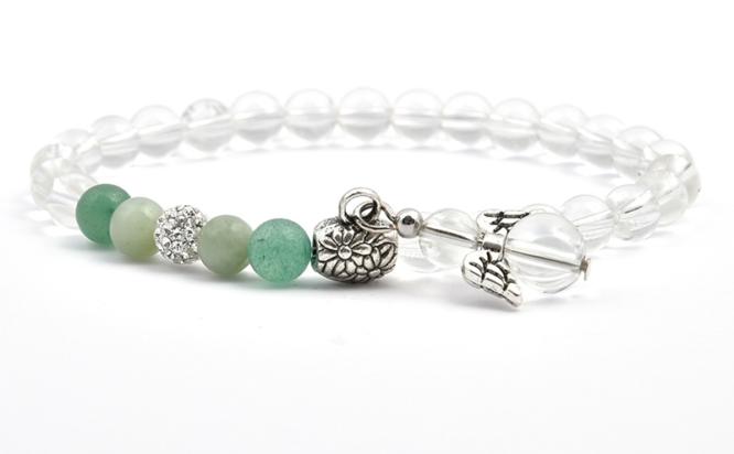 A hegyikristály, a jáde és az aventurin 6 mm-es ásványgömbjeiből készült gumis karkötő. Díszítőelem : 1 db 6 és 8 mm-es hegyikristály gömbből készített angyal és 1 db 6 mm-es extra minőségű strasszgolyó. A felhasznált fém díszítő elemek antiallergének. A karkötő méretének meghatározása : a csuklód méretéhez adj hozzá 1,5 cm-t. KÉRLEK VÁLASSZ MÉRETET ! Az