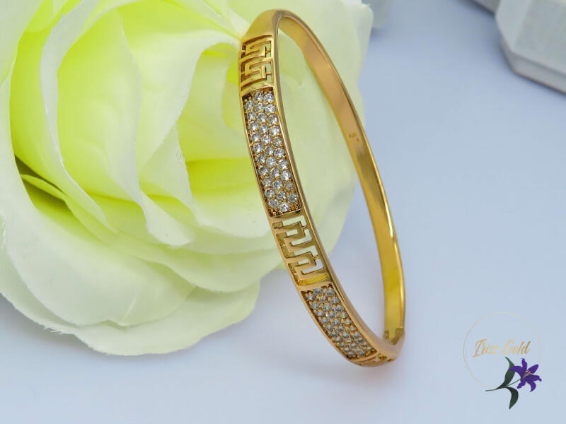 Gold Filled gyönyörű szolid karperec mini cirkóna kövekkel díszítve , kis görög motívum teszi egyedivé Szin: 18K Méret: 57-es kb 18 cm-es csuklóra jó A forgalmazott divatékszerek alapanyaga nikkel és ólommentes ezért többnyire nem okoznak allergiás tüneteket, nyugodtan hordhatják fémérzékeny emberek is. Általában nem színezik a bőrt és más divatékszerekhez képest n