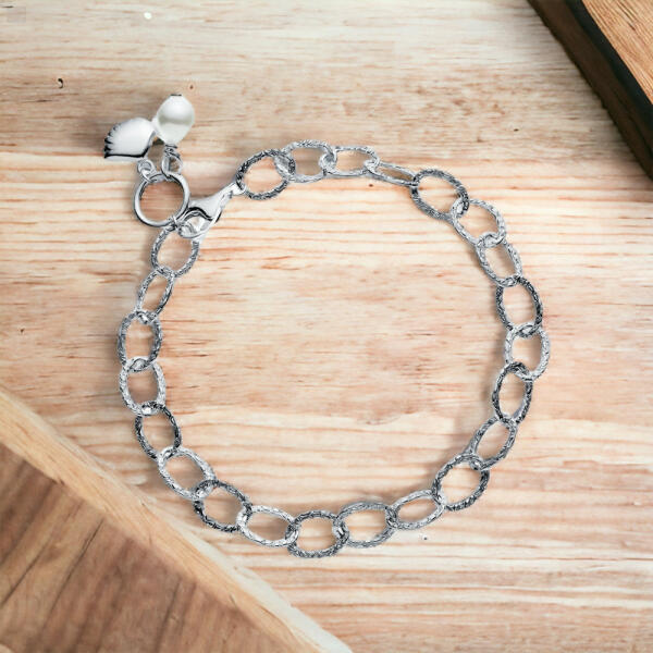 Az ezüst (925) texturált karkötő - gyöngy és kagyló egy gyönyörű és elegáns ékszer, ami minden nő számára tökéletes választás. A karkötőt kézműves technikával készítik, ahol a legmagasabb minőségű ezüstöntött felhasználásával hozzák létre a tökéletes darabot. Az ezüst (925) texturált karkötő alapjául egy gyönyörű textúrázott ezüstlánc szolgál. E