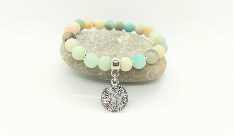 Egyedi tervezésű matt amazonit ásványokból készült karkötő, életfa medállal díszítve.