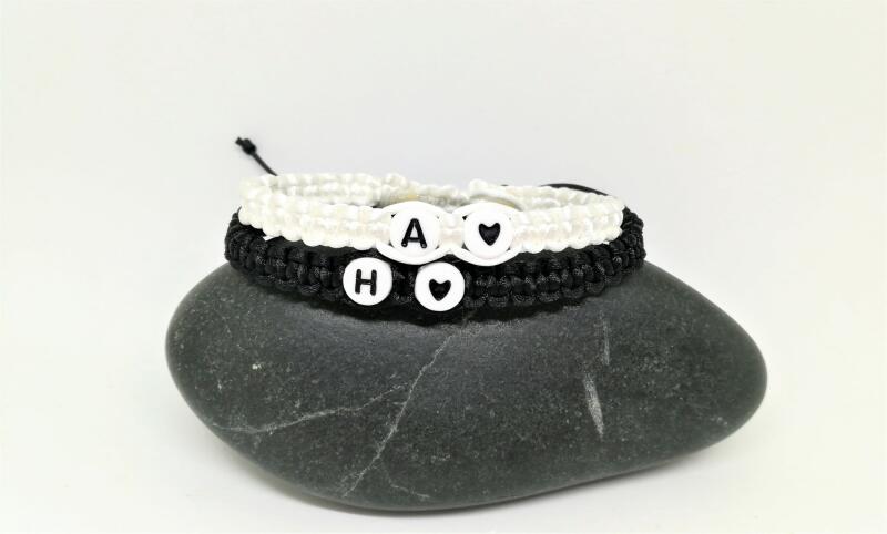 Gyönyörű szabadon választható betűkkel ellátott karkötő, mely vékony selyem zsinórból font és fehér betűket tartalmaz + egy-egy szívecskét a betűk után.