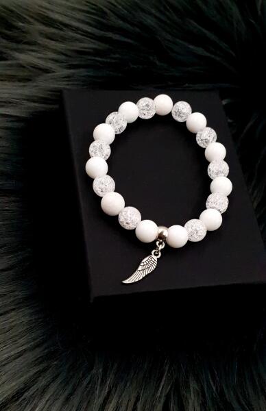 Gyönyörű egyedi karkötő fehér tejkvarc és roppantott hegyikristály kombinációjával, védelmező angyalszárny medállal díszítve
