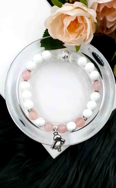 Egyedi tervezésű rózsakvarc, tejkvarc, howlit és matt hegyikristály ásványokból készült hajszárító és olló medálos ásványkarkötő. Szuper ajándék lehet a kedvenc fodrászunknak!