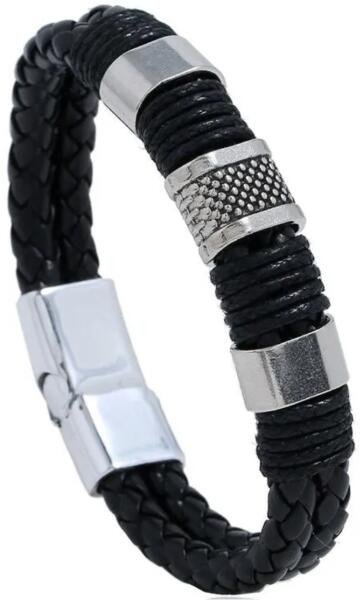 Kerim karkötő Ez a modern férfi karkötő bőr és ezüst színű fém elemek kombinációjából ideális kiegészítő azoknak a férfiaknak, akik a stílusos és robusztus megjelenést preferálják. A fonott bőr textúrát és karaktert ad a karkötőnek, míg a fém részletek indusztriális eleganciát és tartósságot kölcsönöznek. Ez a karóra tökéletes kiegészítő a mindennapi