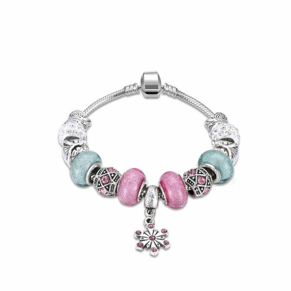Cikkszám: 0554 Charm karkötő: - platina bevonattal, - csillogó világoszöd és rózsaszín üveggyöngyökkel, - áttetsző és rózsaszín kristályokkal, - hópehely alakú díszítéssel. Hossza: 20 cm. Súlya: 45 g. Alapanyaga: minőségi fémötvözet. Csodálatosan szép, exkluzív, kristályos karkötő! A megadott méreteket kérjük vegyék figyelembe!