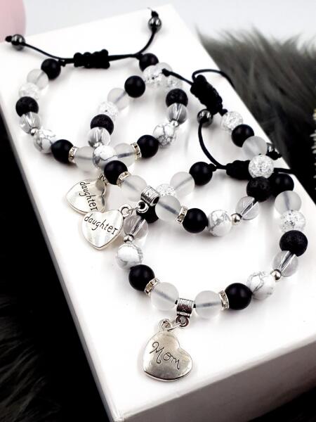 Gyönyörű 3 részes Anya és Lánya szett, Anyának és két lányának "MOM" és kettő darab "DAUGHTER" medállal, mely szimbolizálja a szeretetet és az össze tartozást közöttük. A termék ára három darab karkötőre vonatkozik díszcsomagolásban. A karkötő ásványai:*hegyikristály *howlit*hematit*Lávakő *ÓnixHa tetszik ez a szett, csak 2 részeset szeretnél belőle, írj nyu