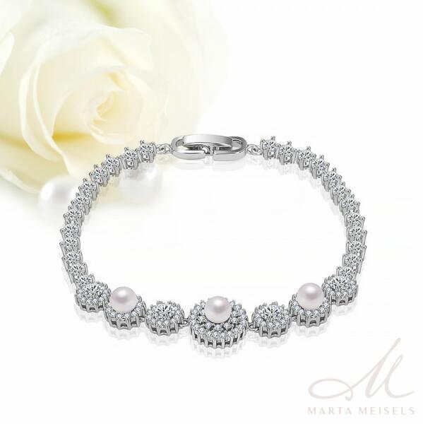 Luxus színvonalon kidolgozott menyasszony karkötő gyöngyökkel és briliáns csiszolású cirkónia kristályokkal gazdagon kirakva. Valódi fehérarany bevonattal készült bőrbarát fémötvözetből. A karkötő mérete (hossza): 19 cm Luxus kidolgozású menyasszonyi karkötő, melyet kifinomult ízlésű aráknak ajánljuk fehér ruhához. Luxus kidolgozású esküvői karkötő ... Mikr