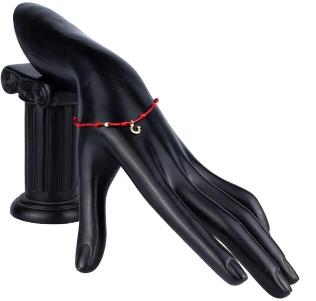 A karkötő egy piros zsinórból áll, hét csomóval és egy arany gyönggyel. A díszítő részen egy patkó található hét kerek kivágással és sima fényes felülettel. A karkötő állítható hosszúságú, hossza arany gyöngyökkel díszített húzózsinórral állítható. Szélesség: 1 mmHossz: 140 mmHosszabbító zsinór hossza: 60 mTeljes hossz a hosszabbítással: 200 mm (+/- 5