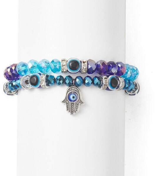 Látványos Fatima keze és Evil Eye motívumos dupla női karkötő, többféle kék színben, rugalmas. Rezin, fémötvözet és üveg, a karkötők hossza kb. 19 cm, rugalmas anyagból. Kiváló kivitelezés, gyönyörűen kidolgozott bohókás, mégis kecses ékszer hölgyeknek. Nőies és látványos karkötő. Méret: körülbelül 19 cm hosszú. Rugalmas. Ha minőségi ajándékot keresel s