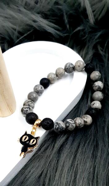 Gyönyörű cica medálos ásványkarkötő, lávakő és zebra jáspis ásványokból készítve, arany díszítéssel.