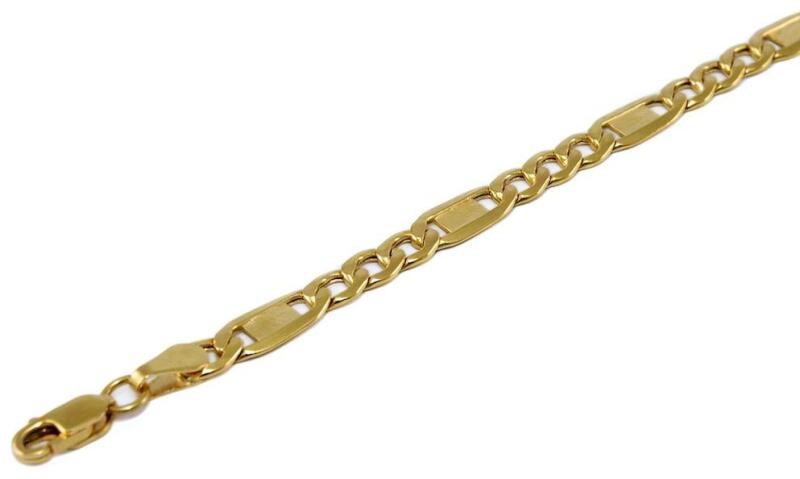 Klasszikus és kedvelt fazonú, fényes betétekkel kombinált, üreges, de masszív kialakítású, 3+1 szemkötésű "Figaró" típusú arany karkötő.