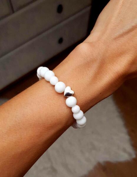 Egyedi tervezésű hófehér szív medálos tejkvarc ásványkarkötő. A karkötő tejkvarcból, roppantott hegyikristálybólés egy szem aurakvarcból készült, strasszos díszitéssel mely letisztult, egyedi darabbá teszi. Tökéletes ajándék!