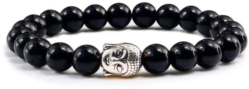 Egyedi készítésű ásványkarkötő, mely fényes ónix ásványokból és ezüst buddha fej medállal készült.