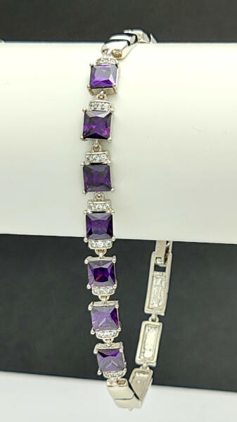 Ezüstszínű karkötő, melyet sötét lila és fehér cirkónia kristályok tesznek csillogóvá. A kristályok a karkötő első harmadát díszítik. A kristályok karmos foglalatban helyezkednek el. Időtálló ékszer, nem feketedik, nem színezi a bőrt ("gold filled"). Mindennapi használatra is tökéletes választás. Antiallergén ékszer. Karkötő szélessége: 6 mm. Az antiallergén