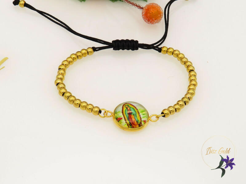 Goldfilled apró aranyszínű gyöngyös karkötő fekete selyem zsinóron Szűz Máriát ábrázoló köztessel Szin: 18K Méret: 14-21 cm Csúszó csomóval állitható A forgalmazott divatékszerek alapanyaga nikkel és ólommentes ezért többnyire nem okoznak allergiás tüneteket, nyugodtan hordhatják fémérzékeny emberek is. Általában nem színezik a bőrt és más divatékszerekhez k