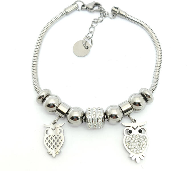 Ezüstszínű nemesacél ( 316L ) pandora jellegű karkötő, melyet bagoly charm díszít és fehér cirkónia kristályok tesznek csillogóvá. A kristályok ragasztott foglalatban helyezkednek el. Mutatós, különleges darab. A karkötő delfin kapoccsal rendelkezik. Tartós, időtálló ékszer, nem feketedik, nem színezi a bőrt. Antiallergén ékszer. Karkötő hossza: 17 cm + 3 cm hosszab