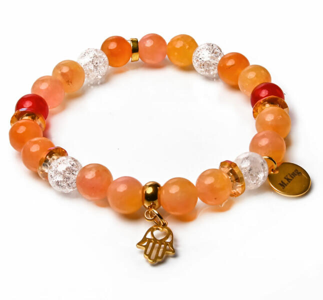 Figyelem! A képen exkluzív kivitelű, rugalmas karkötő látható kapocs nélkül, de kérheted extra erős acélsodronyra is delfinkapoccsal és 5 cm hosszabbítólánccal. Ha a kapcsos verziót kéred, ami nem szakad, nem nyúlik, válaszd ki a listából, vagy írd be a Megjegyzésbe, és a csuklód körbemért méretét is add meg. A karkötőt alapesetben a képen is látható charmmal kü