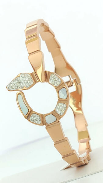 Rose gold színű nemesacél (316L) kígyó karperec melyet fehér cikrónia kristályok tesznek csillogóvá és kagyló betétek teszik egyedivé. A kristályok ragasztott foglalatban helyezkednek el. A karperec elülső fele díszített. A karperec kinyitható a könnyebb felhelyezés érdekében ( rugós zárszerkezet ). Minőségi, tartós anyagának köszönhetően akár mindennapi viseletne