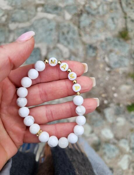 Mama feliratos ásványkarkötő, arany díszítéssel, fehér betűgyöngyökből és howlit ásványokból készült.
