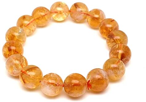 A citrin golyók gumira vannak felfűzve. Amit a citrinről érdemes tudnod: A citrin a sárgának szinte mindenféle színárnyalatát felvonultathatja. Az ásvány akkor keletkezik, amikor a kcvarot enyhe radioaktív sugárzás éri. Ritka kőről lévén szó, az értéke magas, gyakran árulnak hevített ametisztet citrin néven. Lelki gyógyhatása: A citrin védelmezi és megtisztítja aurá