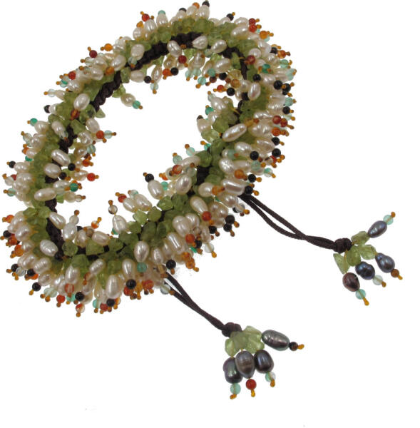 Tenyésztett gyöngy karkötő szabálytalan természetes peridottal (olivinnel) és apró vegyes színű kövekkel (Ónix, achát, karneol). A karkötő csúszó zárral állítható, zsinór alapra van rádolgozva, hossza kb. 17-19 centi közti csuklóra megfelelő. A peridot vélt hatása.