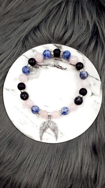 Gyönyörű egyedi ásványkarkötő a nyugalom ásványaival: szodalit, rózsakvarc, ónix, dupla angyalszárny medállal díszítve.
