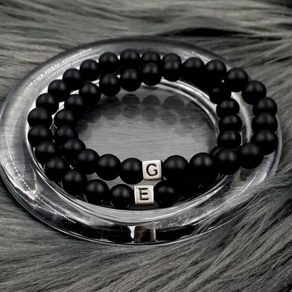 Gyönyörű, 8 mm ónix ásványgyöngyökből készült karkötőpár, egy-egy betűvel. Ez a karkötőpár az összetartozást szimbolizálja a neveitek kezdőbetűinek cseréjével. Az ár egy pár (2db) karkötőre vonatkozik.