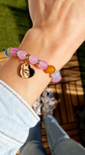 Keri medálos kristály karkötő 8 mm-es ásványgyöngyből készítve. 1 cm átmérőjű nemesacélból készült gravírozott medállal. Megrendelhető a képen látható rosegold színben, vagy akár ezüst stílusban is. Tökéletes ajándék Keresztmamának, Keresztanyukának!