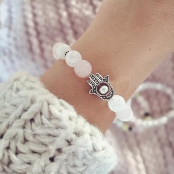 Gyönyörű Yvonne Design LUXURY tejkvarc és matt rózsakvarc ásványokból készült karkötő hamzsakéz medállal.