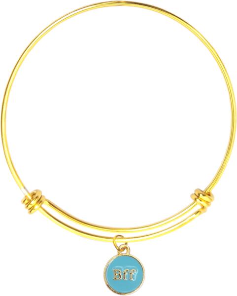 Átmérője 6 cm. Valamelyest rugalmasan felvehető, nem nyitható, tehát a kézfej is átbújik a karperecen. Kb. 17-18 cm-es körméretű csuklóig ajánlott. BFF kék medál arany színű karperecen. Best friends forever - legjobb barátok örökké. Paraméterek:Medál / mérete kb. 1,4 cm. Medál anyaga fém ötvözet. Karperec anyaga rozsdamentes acél.