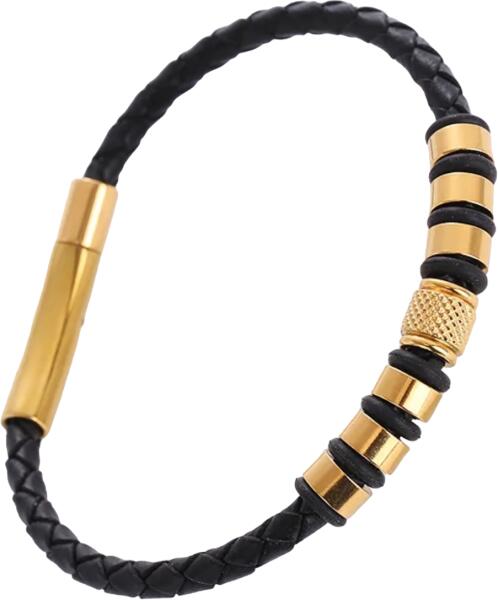 George karkötő Ez az elegáns karkötő a modern stílust luxuselemekkel ötvözi, a fekete fonott bőr és az arany részlet révén. Ideális olyan férfiak számára, akik kifinomult kiegészítőt keresnek, amely kiemeli személyiségüket. Az arany fém elemek egyedi megjelenést kölcsönöznek a karkötőnek, amik a fekete bőr struktúrával kontrasztban érdekes vizuális hatást hoznak