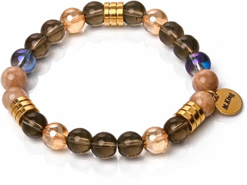 Vagány, mégis kifinomult füstkvarc, aura kvarc és napkő ásvány karkötő férfiaknak és nőknek is, hiszen a dizájn férfias, mégsem otromba, színe föld szín, mégis sejtelmesen csillog. A Maria King kollekció kiemelt darabja. Figyelem! A képen exkluzív kivitelű, rugalmas karkötő látható kapocs nélkül, de kérheted extra erős acélsodronyra is delfinkapoccsal és 5 cm hossz