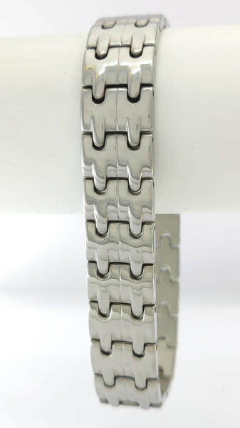 Ezüstszínű nemesacél (316L) karkötő. Tartós, minőségi ékszer, nem feketedik, nem kopik. Mindennapi viseletnek is tökéletes választás. Antiallergén ékszer. Hosszúság: 21 cm. Szélesség: 14 mm. Igény esetén rövidíthető, melyet ajándékként elvégzünk. A kért méretet kérjük a megjegyzés rovatban feltüntetni. A nemesacél ékszerek rendkívül népszerűek kedvező tul