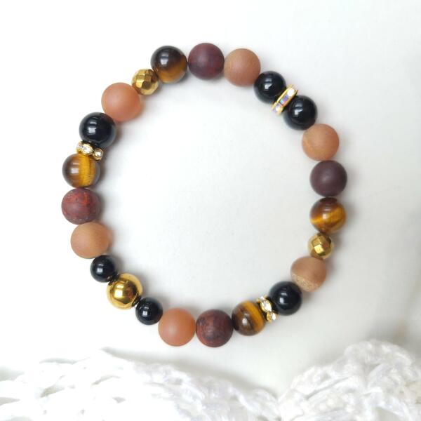 Őszi hangulatú ásványkarkötő. Egyedi tervezésű tigrisszem, képjáspis, druzy narancs achát, arany hematit, és ónix ásványokból készült, és arany díszítéssel.