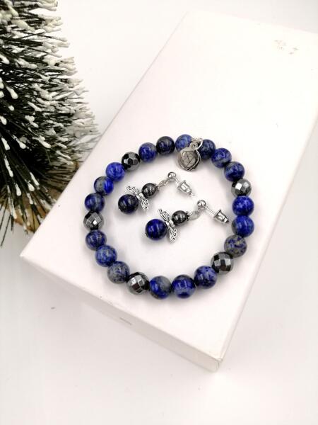 Ékszerszett, mely egy angyalka fülbevalópárból és egy karkötőből áll, mely lápisz lazurit illetve fazettált hematit ásványokból lett készítve ! Ez a szívhez szóló személyes ajándék, egészen biztos, hogy örök élmény marad és sikert arat!