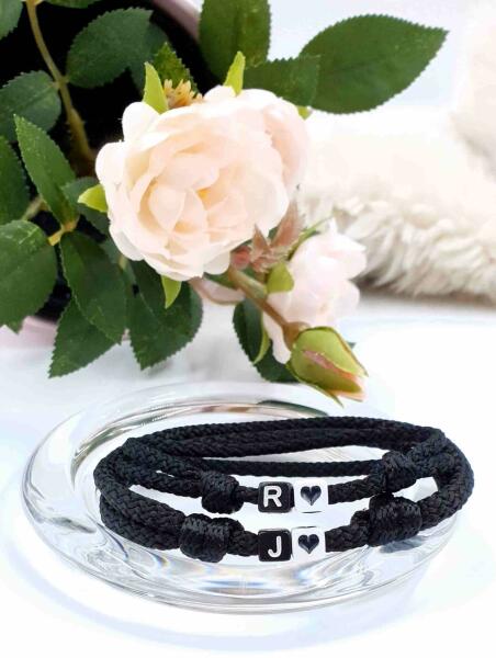 Ez az egyedi karkötő pár, fekete parakord zsinórból készült, csomózásos makramé technikával. A betűk - melyeket egyedileg adhatsz meg- fekete színűek, a szívecske gyöngy pedig fehér. A karkötő méretre készül és pontos precíz eldolgozásokkal, gyönyörű, hibátlan tökéletes darabot fogsz kézhez kapni! A betűket egyedileg rendelheted hozzájuk, így személyre szabottan