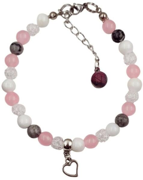 Yvonne Design Rose apró gyöngyös ásványkarkötő. Egyedi tervezésű rózsakvarc, zebrajáspis, roppantott hegyikristály ásványokból készült karkötő, szívecske medállal díszítve, 6 mm-es apró gyöngyökből, kapoccsal és lánchosszabbítóval.