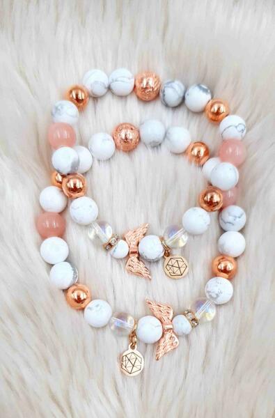 Yvonne Design Rosegold angyal karkötőpár, barátság karkötőként, vagy Anya és Lánya részére, mely a szeretetet és az össze tartozást jelképezi. Az ékszett két karkötőből áll. A karkötőkön egy-egy angyalka található, és rosegold szín díszítésűek, az alábbi ásványokból készült:*áttetsző aurakvarc hegyikristály*Mashan (lazac) jáde*Howlit*Lávakő