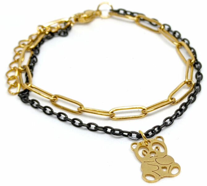 Nemesac l Panda charmos dupla karkötő. Karkötő mérete 17+5 cm. (Ha ettől eltérő méretet szeretnél, rendeléskor a MEGJEGYZÉSBE írd be. ) Paraméterek: Charm mérete 1,6x1,2 cm. Anyaga nemesacél, karkötő anyaga rozsdamentes acél. Karkötők szélessége 4 és 3 mm.