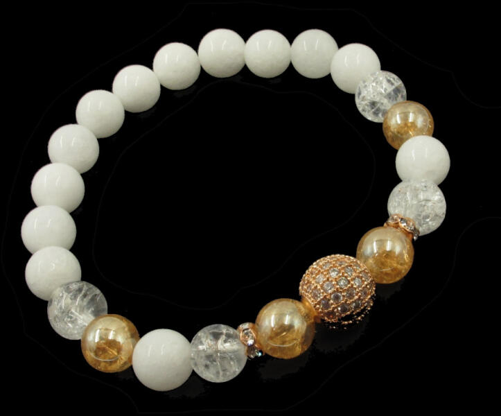 Tejkvarc karkötő Napfény Aura kvarcokkal és roppantott hegyikristályokkal rózsa arany mikrostrassz díszítéssel. A karkötő rugalmas gumira van fűzve, a pontos méret kiválasztható. Hogy mi is a napfény aura? Ez a feltűnően sárga kristály úgy kapta a színét és feltűnő szivárványos ragyogását, hogy a hegyikristályra alkímiai úton arany és platina bevonat került, így