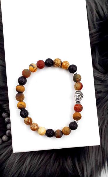 Gyönyörű Buddha fejes ásványkarkötő picasso jáspis ásványból, lávakő díszítéssel.