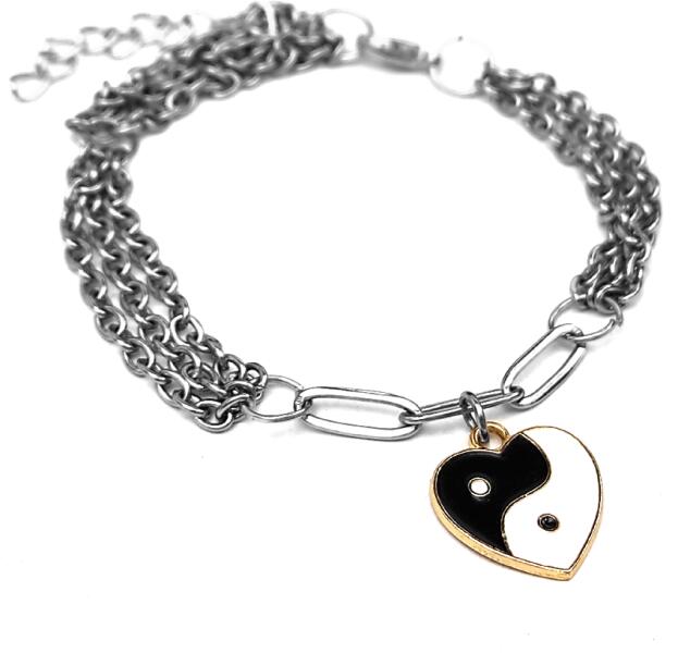Három soros divat karkötő fekete-fehér szív alakú jin-jang charmmal, ezüst színű. Paraméterek: Charm mérete kb. 1,5 cm. Anyaga fémötvözet, karkötő anyaga rozsdamentes acél. Karkötő mérete 17+5 cm. (Ha ettől eltérő méretet szeretnél, rendeléskor a MEGJEGYZÉSBE írd be. )