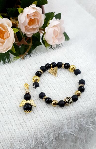 Ékszerszett, mely egy ásványkarkötőből és egy táskadíszből áll. Matt ónix, fényes ónix és matt hegyikristály ásványokból készült karkötő, arany szín díszítéssel és egy LUXURY cirkon gömb medállal.