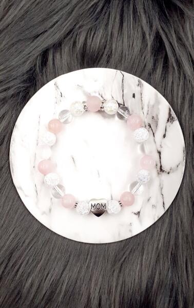 Gyönyörű hegyikristály és rózsakvarc ásványokból készített karkötő "MOM" (Anya) medállal.