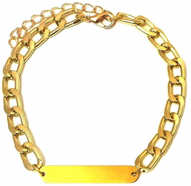 Lapocska anyaga rozsdamentes tükörpolírozott nemesacél, gravírozható. (Gravírozást nem vállalunk. ) A lapocska mérete kb 30x6 mm. Karkötő körmérete: 17+5 cm, anyaga rozsdamentes fém, vastagsága kb 6 mm. (Ha hosszabb karkötőt kérsz, megjegyzésbe írd be)
